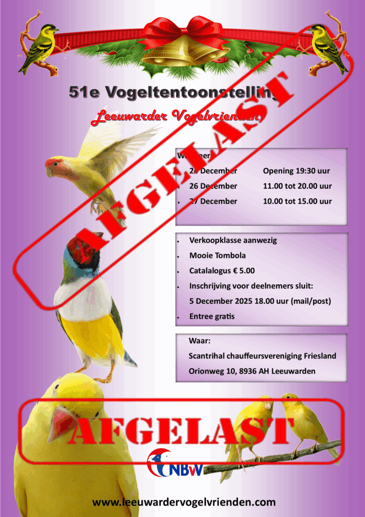 Helaas kunnen de districtsshow en de Friese Kampioenschappen voor volièrevogels niet doorgaan i.v.m. het risico van Vogelgriep!